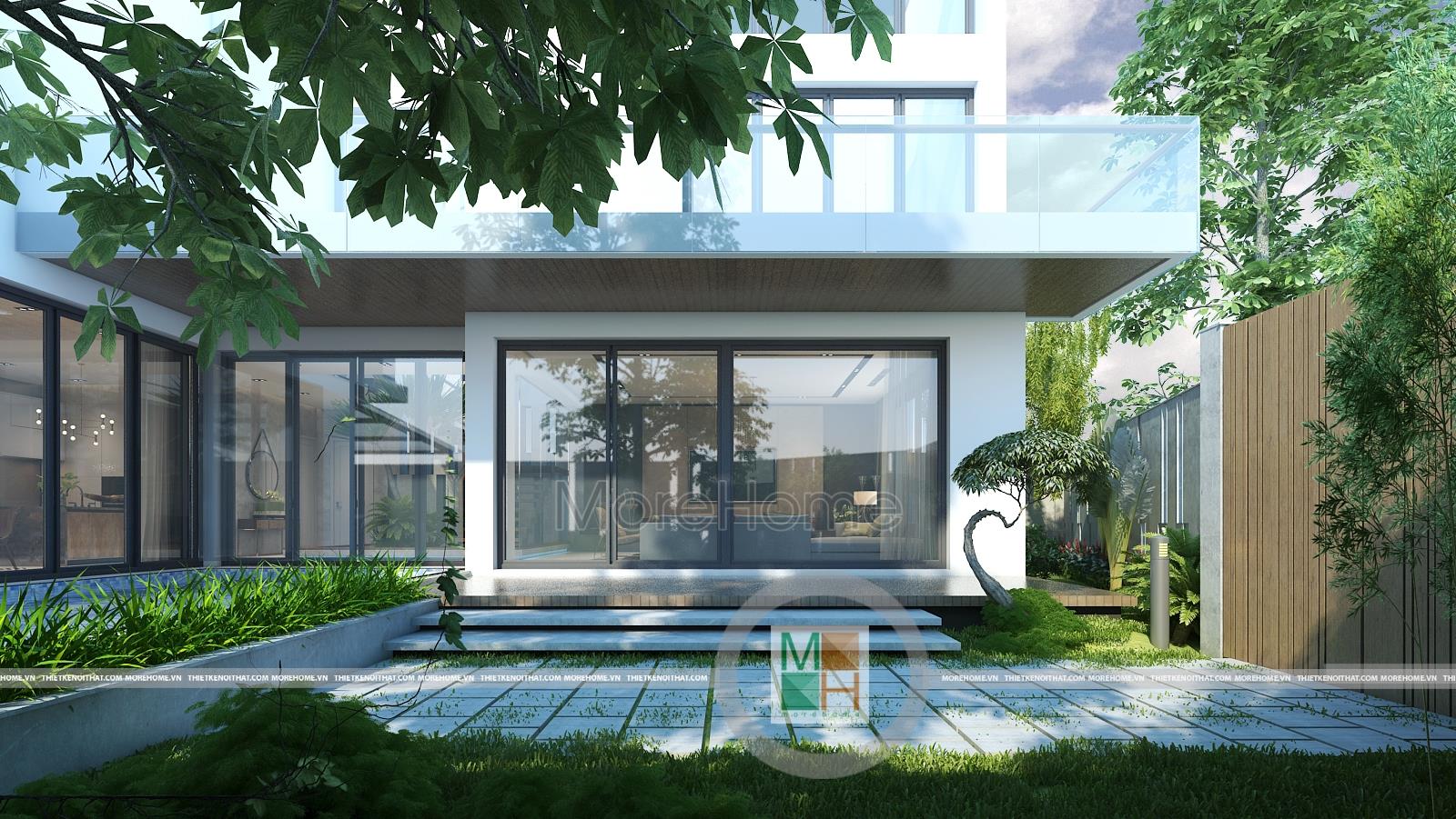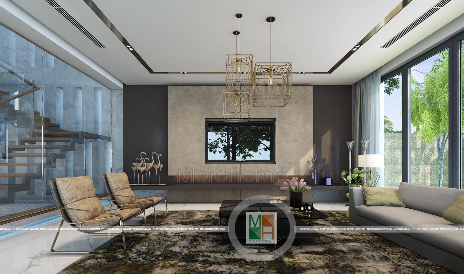 Khoảng sàn ngoài hiên được làm từ gỗ khối tự nhiên cao cấp. khối gỗ dày tạo cảm giác vô cùng chắc chắn. Từ bậc thềm tam cấp đưa bạn vào không gian phòng khách hiện đại dưới tầng 1, bộ sofa chữ L được kê sát vách kính góc còn lại là 2 chiếc ghế thư giàn bọc da. Đèn trang trí được thiết kế theo cấu trúc đèn lồng khá độc đáo mang trên mình phong cách truyền thống nhưng lại được nhấn nhá với màu sắc của phong cách hiện đại cùng tông màu với ghế thư giãn. Tất cả được bố trí hài hòa tạo nên một tổng thể hoàn thiện.