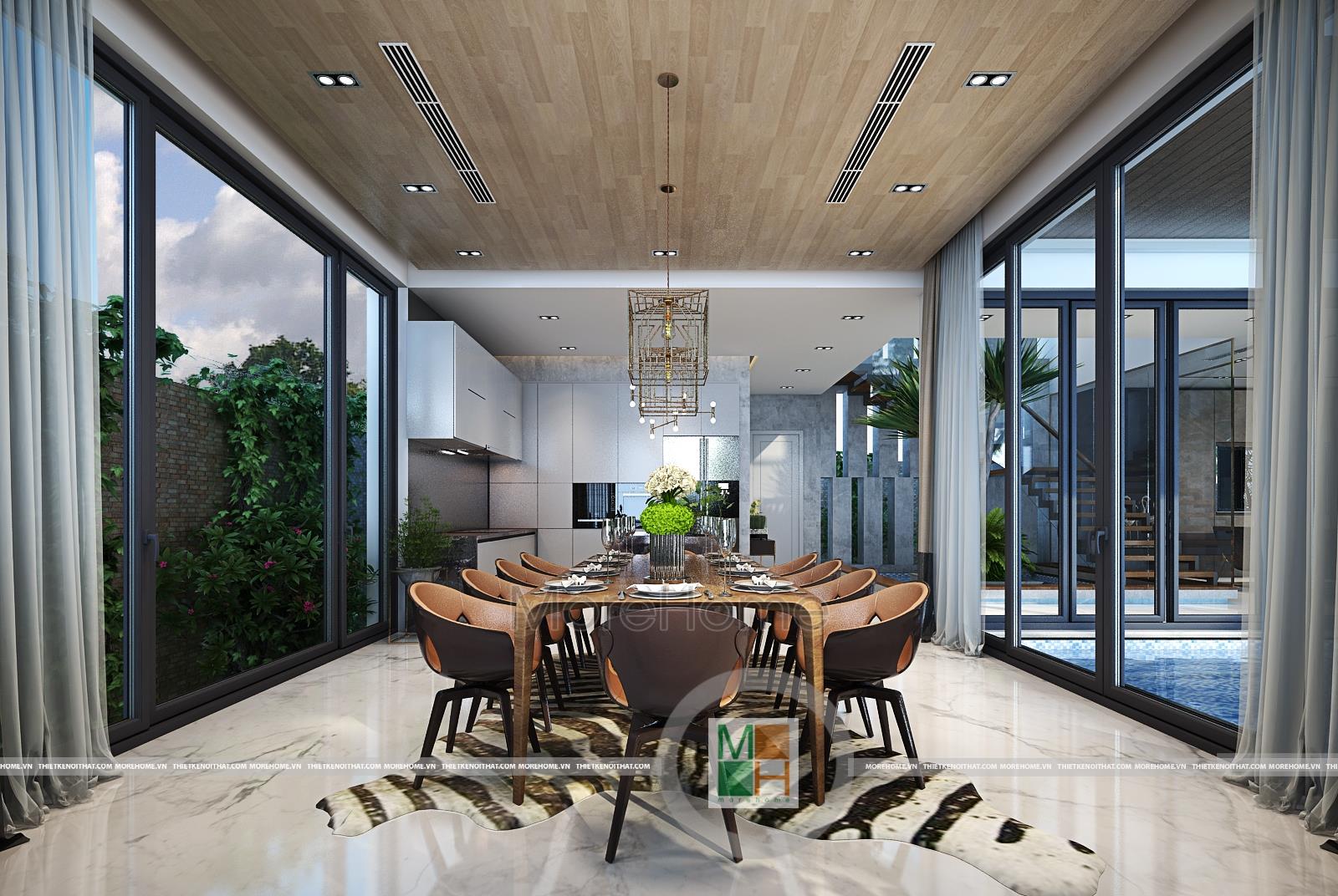 Phân tách giữa phòng khách với các không gian khác là vách kính cường lực trong suốt nhưng vẫn có được sự liền mạch. Sau vách kính là cầu thang lên tầng 2. Với không gian rộng nên dưới chân cầu thang còn được bố trí thêm tiểu cảnh với cây xanh và một bồn nước nhỏ điều hòa không khí cho phòng ăn và phòng bếp bên cạnh. Phòng ăn và phòng bếp được thiết kế trong cùng một không gian nội thất. Các kiến trúc sư đã khéo léo sắp đặt thành một không gian riêng biệt tạo thành góc L với cấu trúc chung của căn biệt thự. Bàn ăn lớn dành cho 10 người rất phù hợp với những buổi tiệc tùng liên hoan hay những bữa cơm sum họp gia đình ấm cúng. Phòng ăn với 3 vách kính thông thoáng nên có thể tận dụng tối đa được ánh sáng tự nhiên và không dùng nhiều tới hệ thống chiếu sáng chung trong nhà. Điểm khác biệt của không gian này là không sử dụng trần thạch cao mà sử dụng trần gỗ tạo điểm nhấn rất riêng.