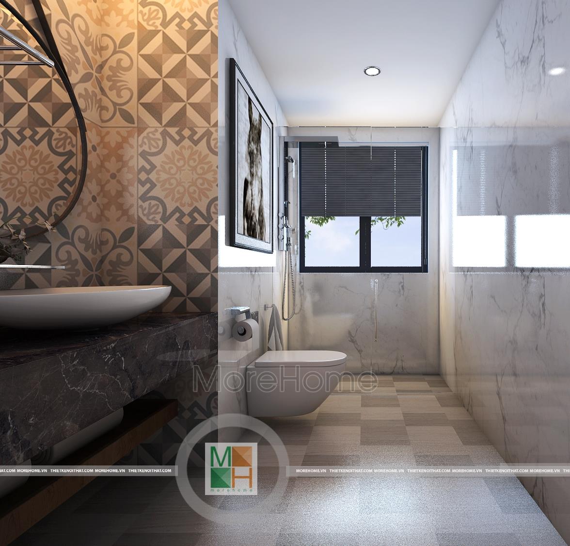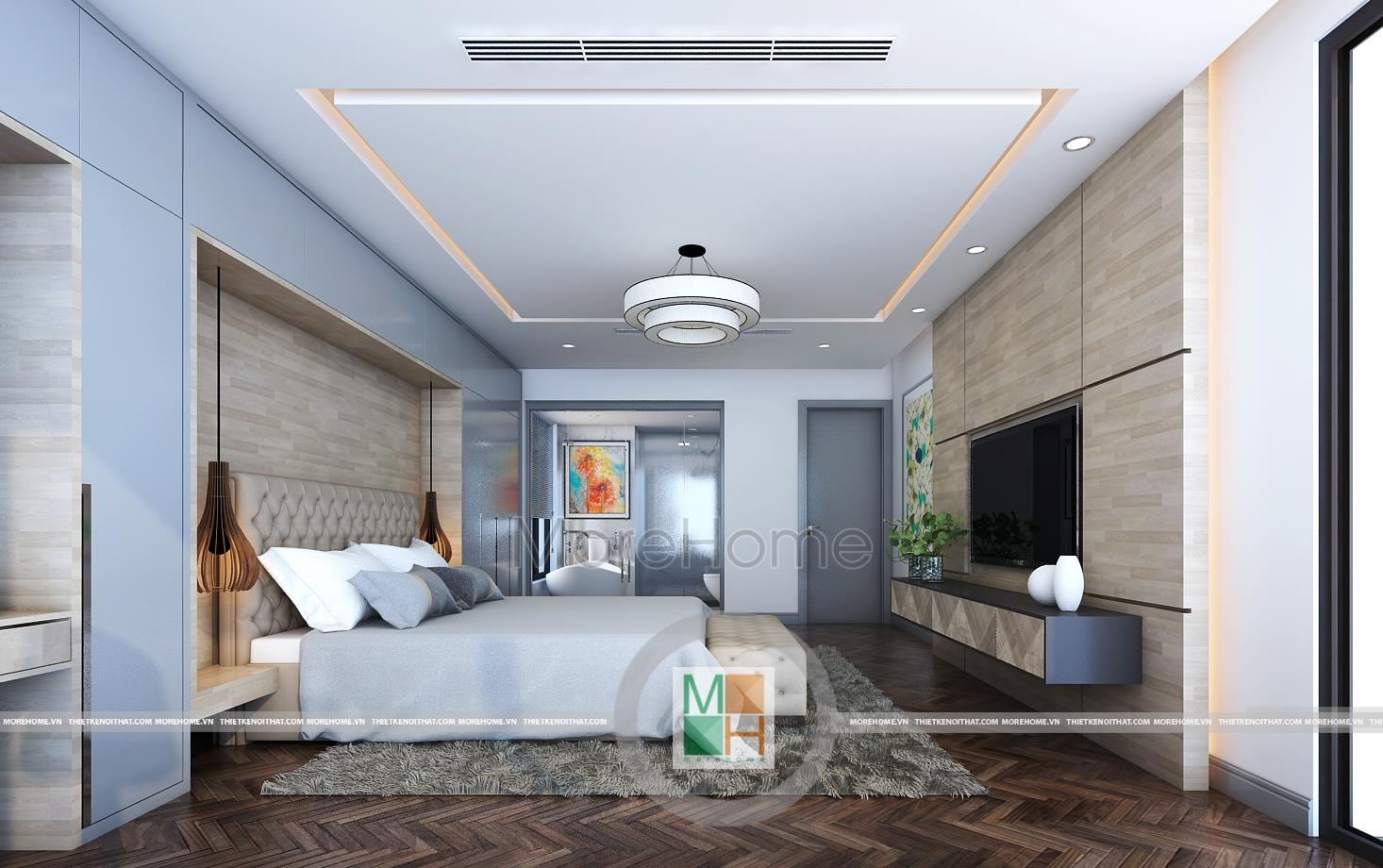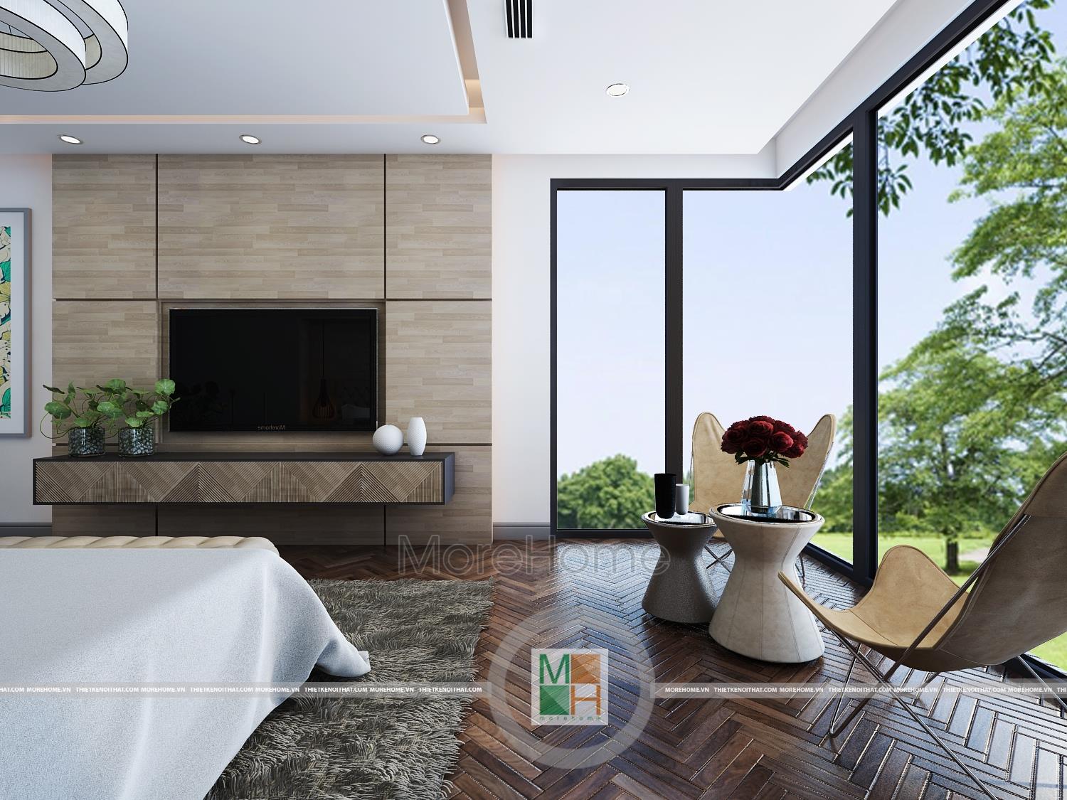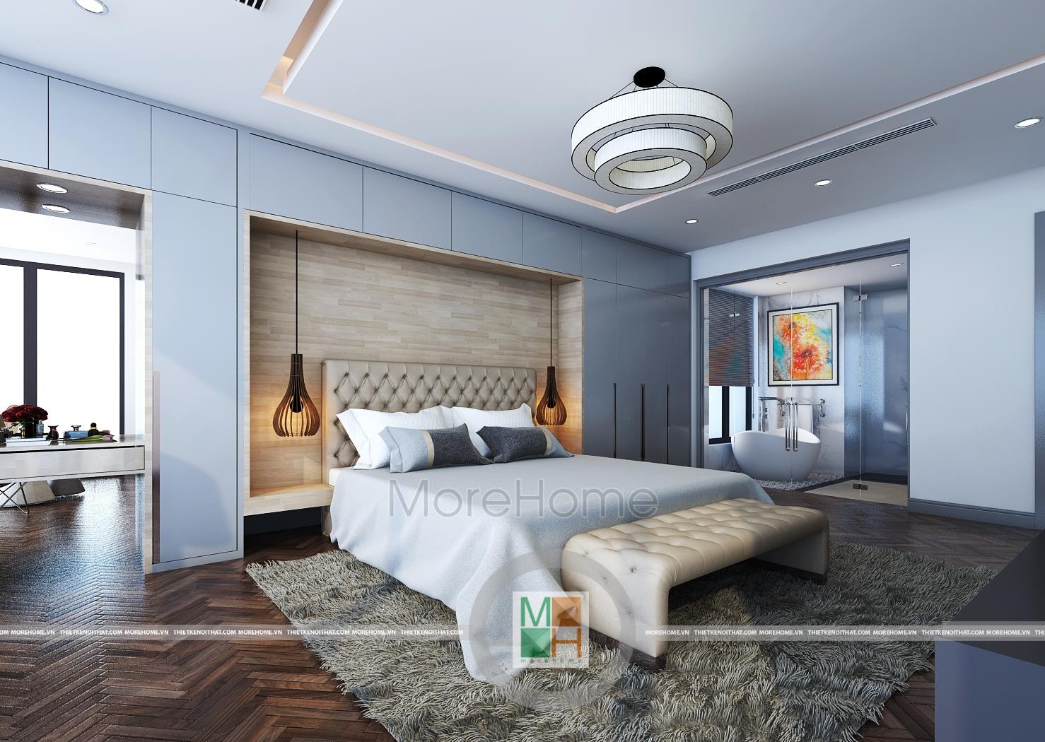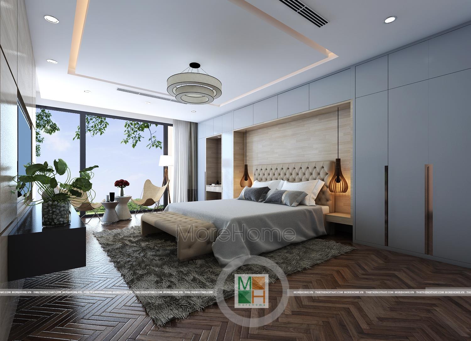 Kết thúc không gian tầng 1 tại đây chúng ta cùng tham khảo thiết kế nội thất tầng 2. Thiết kế cho tầng 2 chủ yếu là các phòng ngủ với 3 phòng riêng biệt khép kín với phòng vệ sinh riêng. Không giống như tầng 1 sàn được lát đá bóng sang trọng thì tầng 2 lại sử dụng ván sàn gỗ tự nhiên ấm cúng, ván sàn được lắp đặt theo hình xương cá đảo chiều cấu trúc rất riêng biệt và độc đáo.