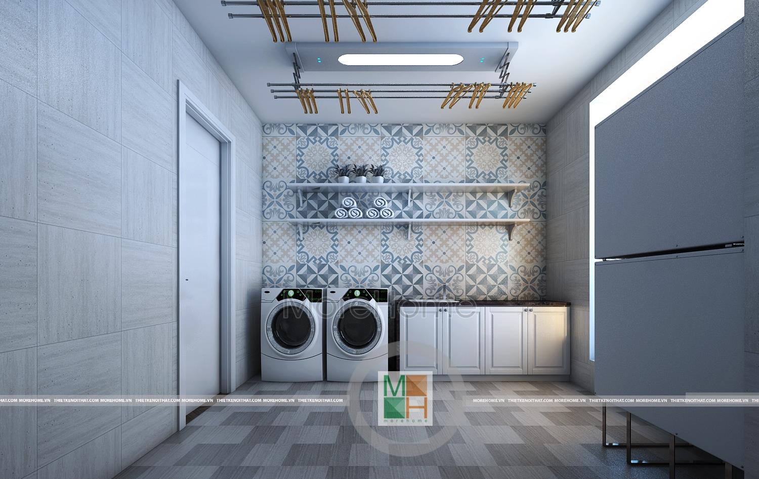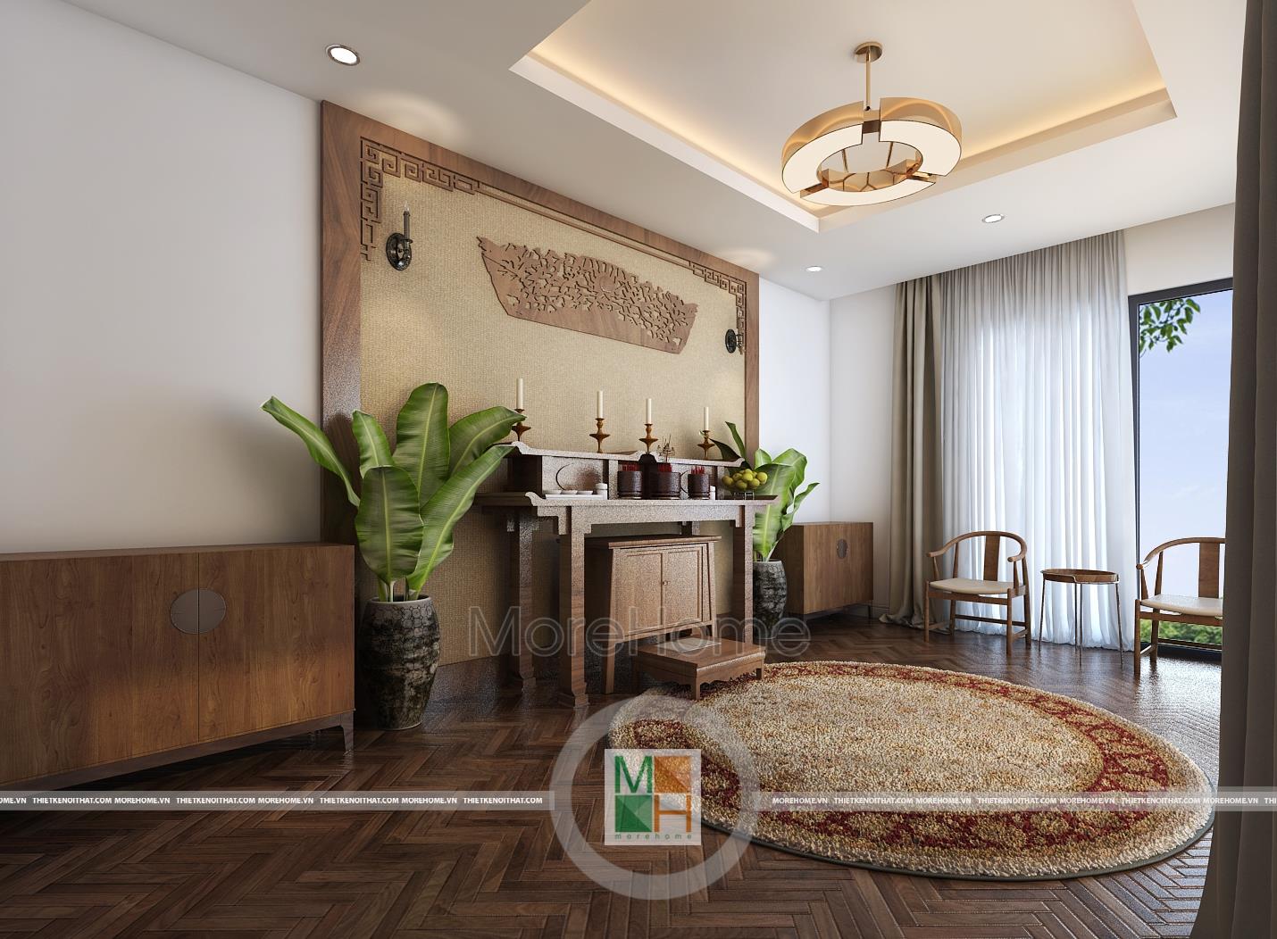 Trên tầng 3 là khu vực tâm linh có phòng thờ riêng khá quy mô với bàn sập thấp, tủ thờ và kệ bàn thờ. Bên ngoài phòng thờ có ban công thoáng.