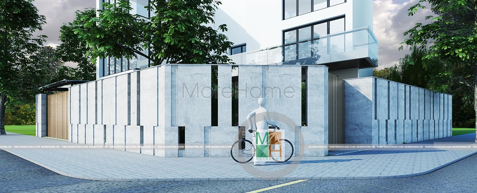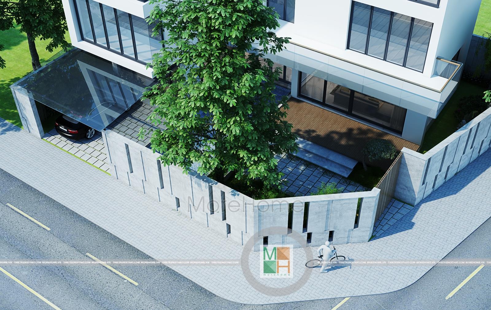 Căn biệt thự nhà anh Phúc tại Nghệ An được thiết kế như một căn biệt thự phố 3 tầng hiện đại không gian sân vườn khá rộng có chỗ để ô tô và bố trí các tiểu cảnh trang trí xung quanh. Căn biệt thự phố 2 mặt tiền nên được thiết kế 2 cổng tại 2 mặt tiền, một cổng cho xe ô tô vào gara và một mặt khác là cổng ra vào chính