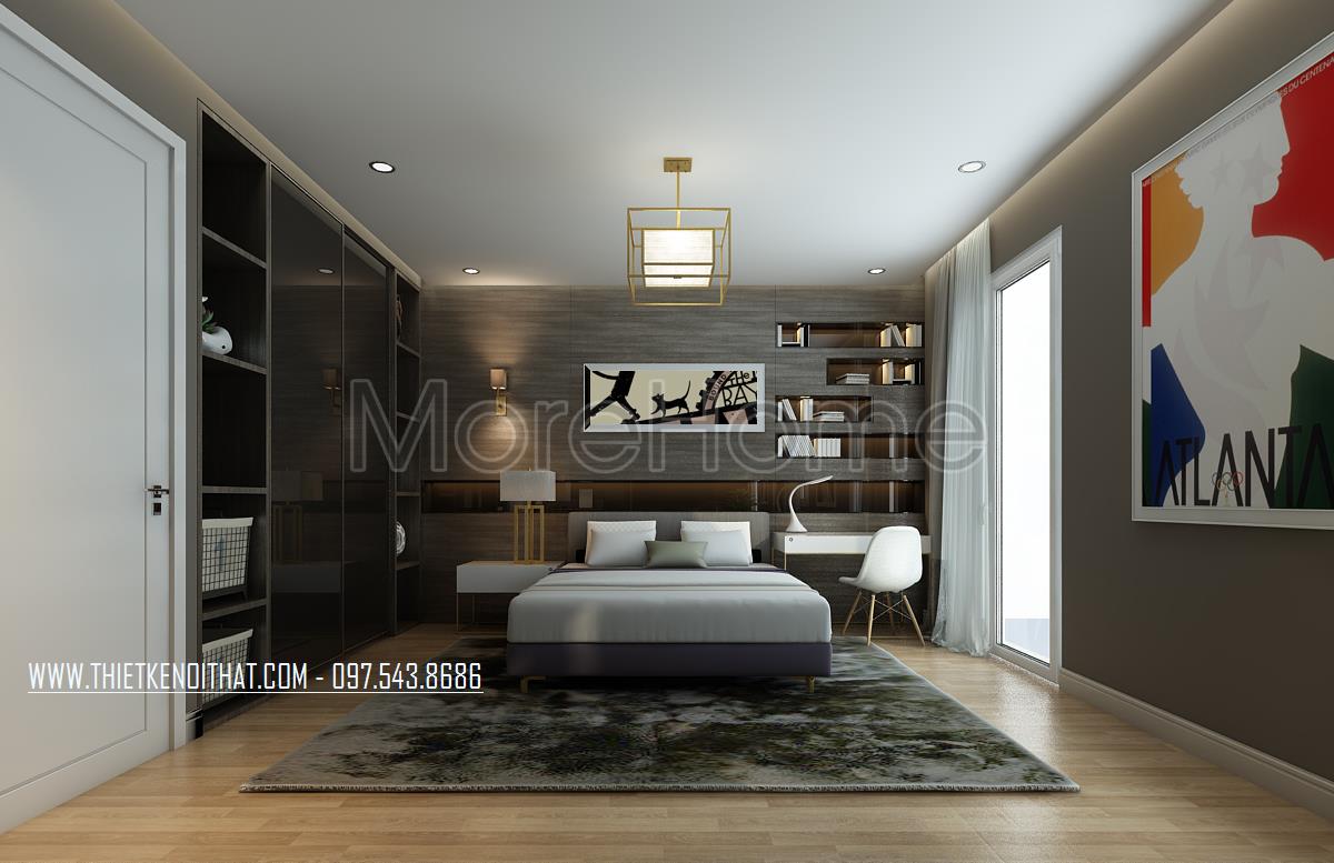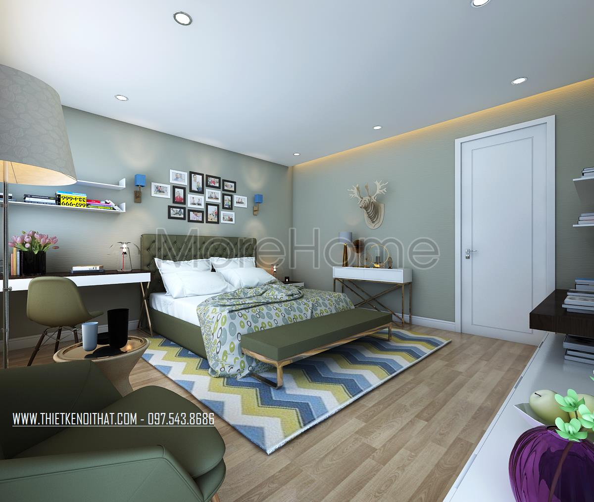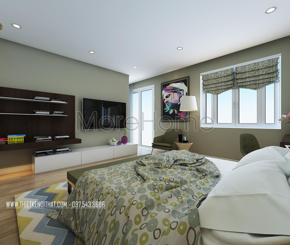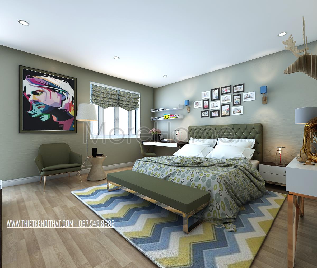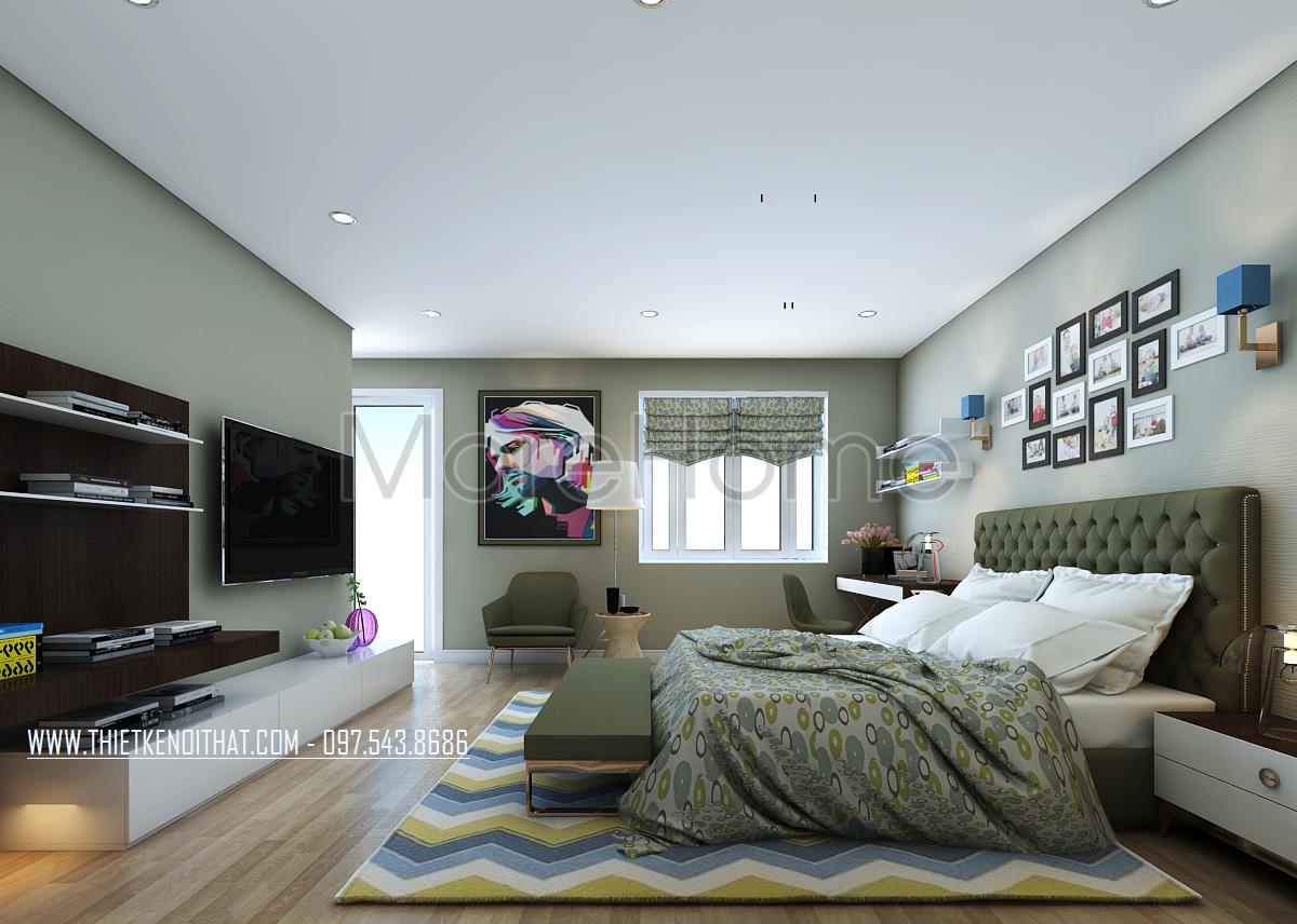 Cuối cùng là thiết kế nội thất phòng ngủ hiện đại. Tone màu nền sáng được sử dụng làm nổi bật lên các đường nét và vật dụng trang trí tạo ấn tượng cho căn phòng. Màu rêu trầm tối được sử dụng khéo léo giúp cân bằng màu sắc và tạo sự hài hòa cho không gian sống. Bên cạnh đó, hiệu ứng ánh sáng và màu sắc còn giúp đem lại cảm giác ấm áp và thân thiện cho không gian sống.