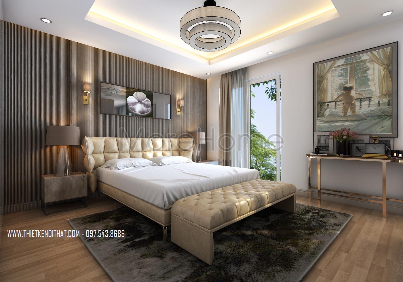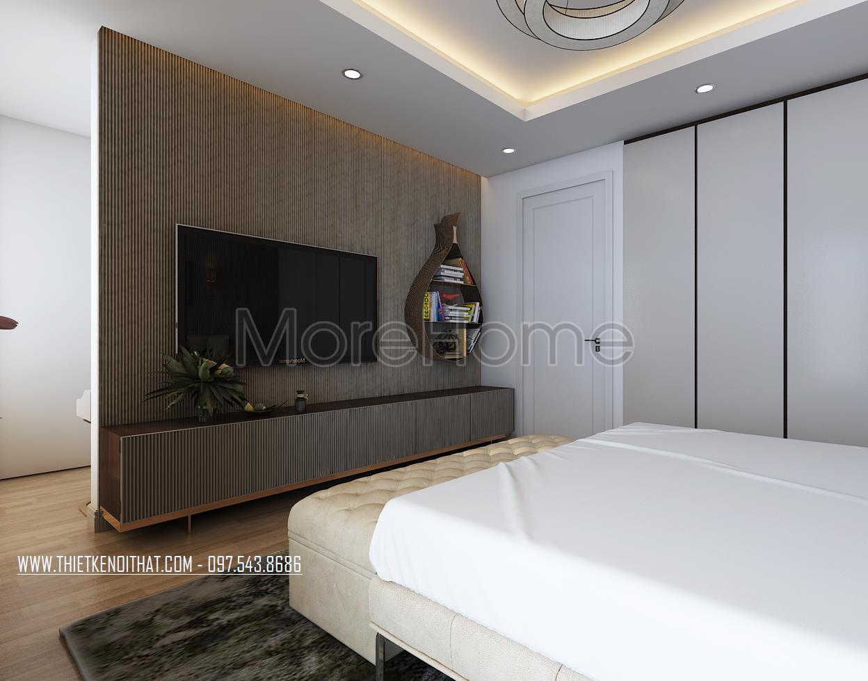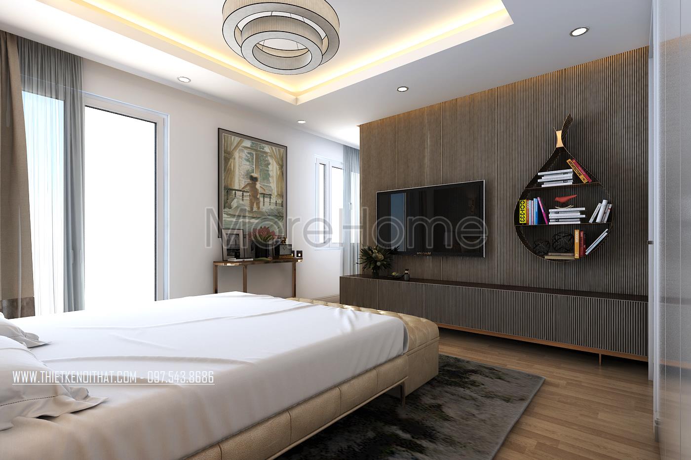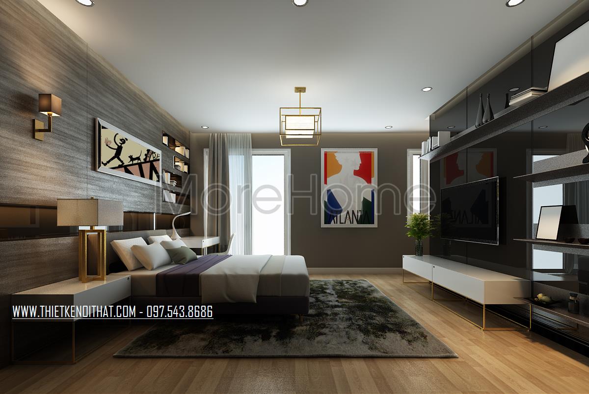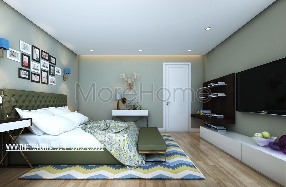 Cuối cùng là thiết kế nội thất phòng ngủ hiện đại. Tone màu nền sáng được sử dụng làm nổi bật lên các đường nét và vật dụng trang trí tạo ấn tượng cho căn phòng. Màu rêu trầm tối được sử dụng khéo léo giúp cân bằng màu sắc và tạo sự hài hòa cho không gian sống. Bên cạnh đó, hiệu ứng ánh sáng và màu sắc còn giúp đem lại cảm giác ấm áp và thân thiện cho không gian sống.