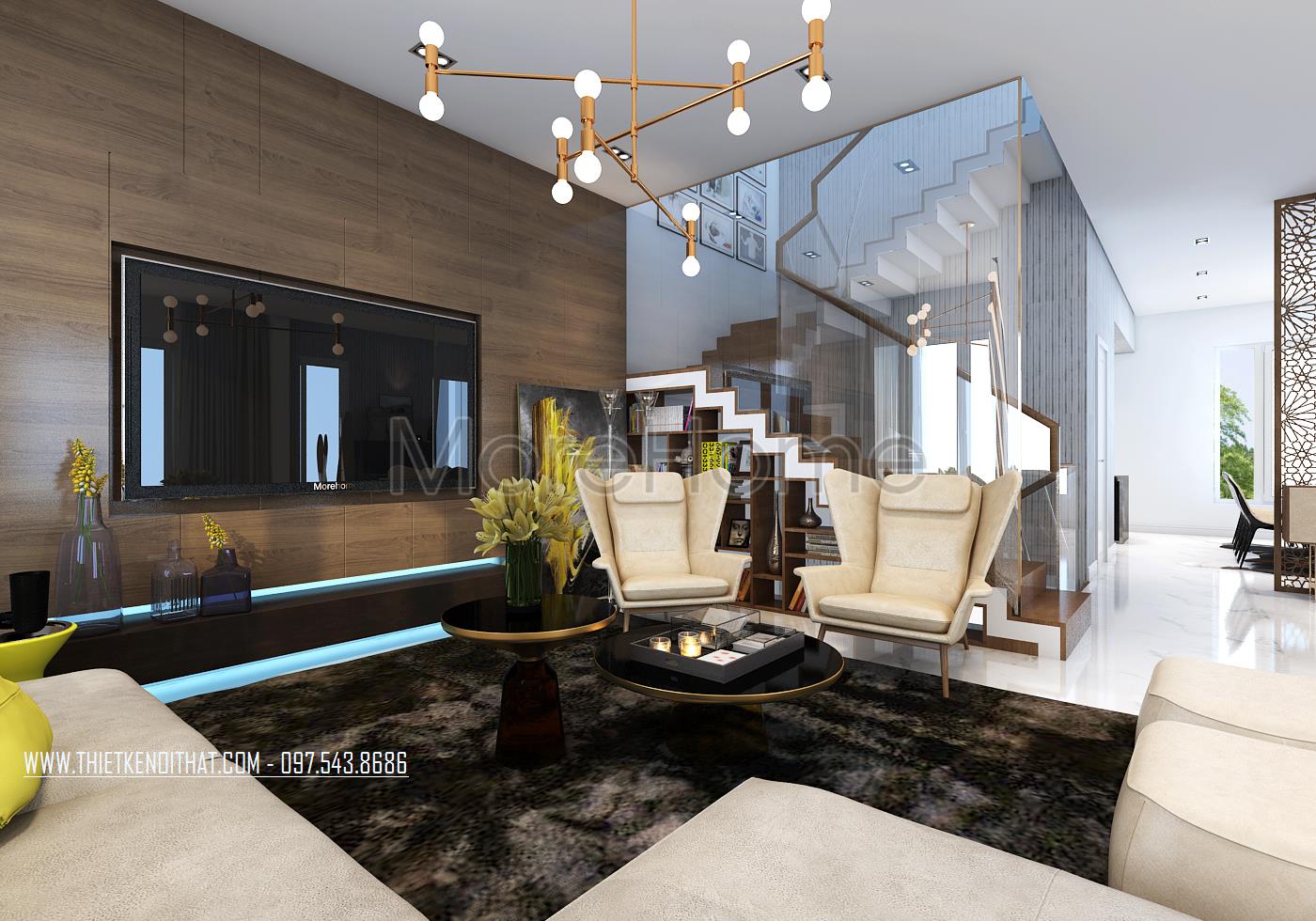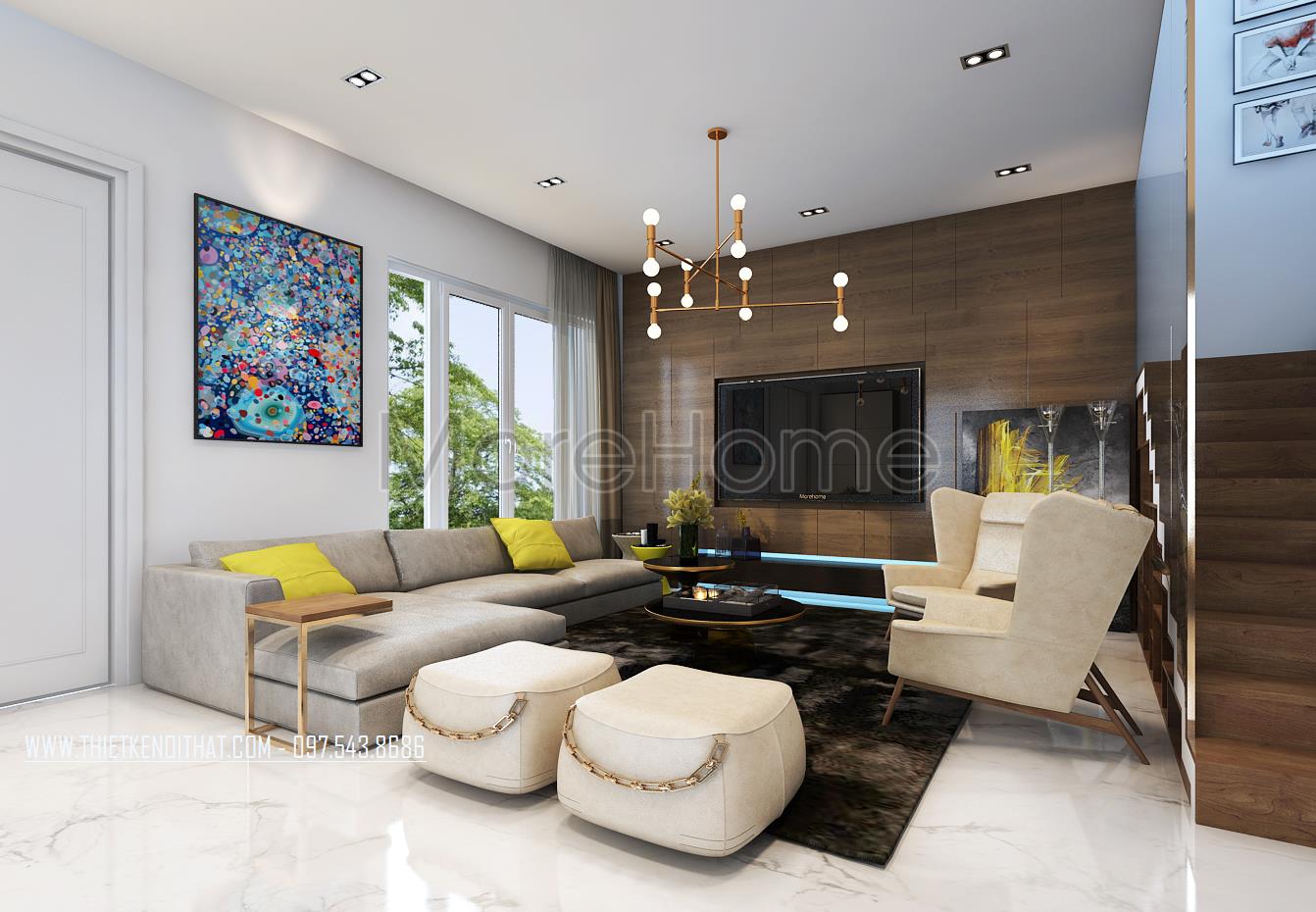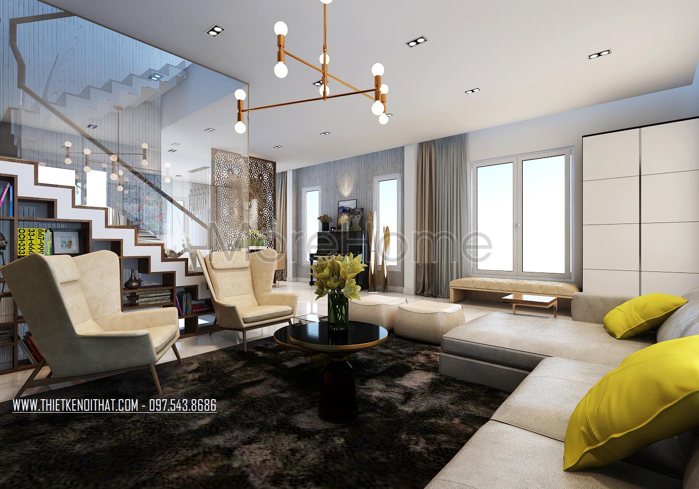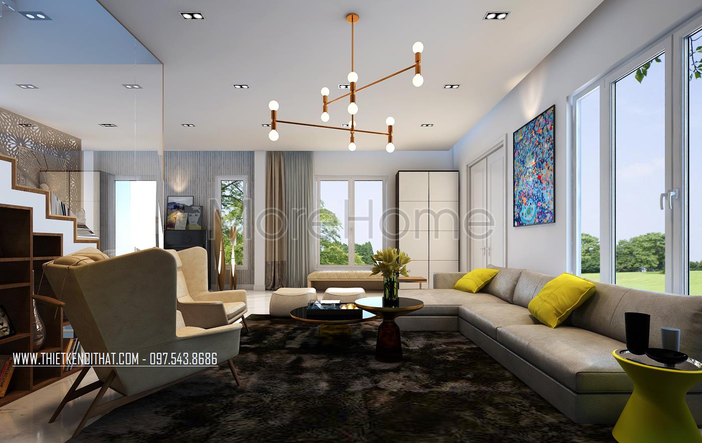 Thiết kế nôi thất phòng khách hiện đại mang đến cảm giác thoáng đãng và thư thái cho giả chủ. Kiến trúc sử khéo léo sử dụng thiết kế với tone màu nhẹ nhàng phối kết hợp với tone màu trầm tối từ thảm trải sàn hay kệ, bàn … tạo sự cân bằng và dung hòa về màu sắc trang trí. Thiết kế của sổ mở rộng giúp mang ánh sáng tự nhiên vào căn phòng, mang lại sự tươi trẻ cho không gian.