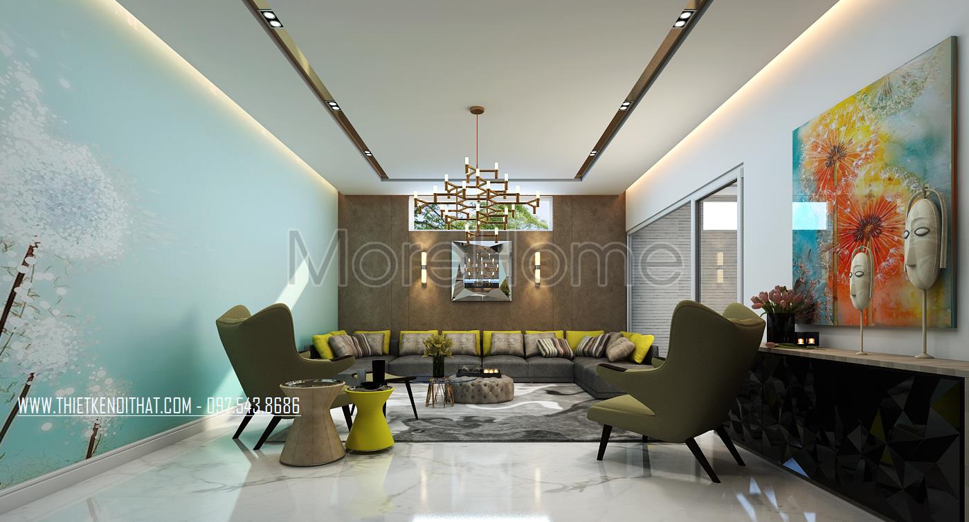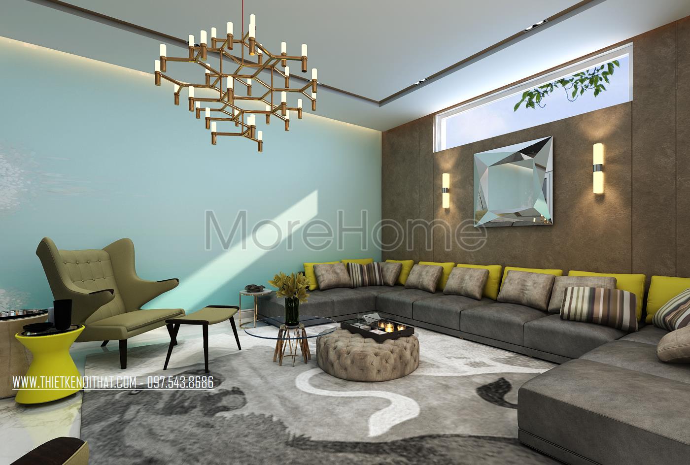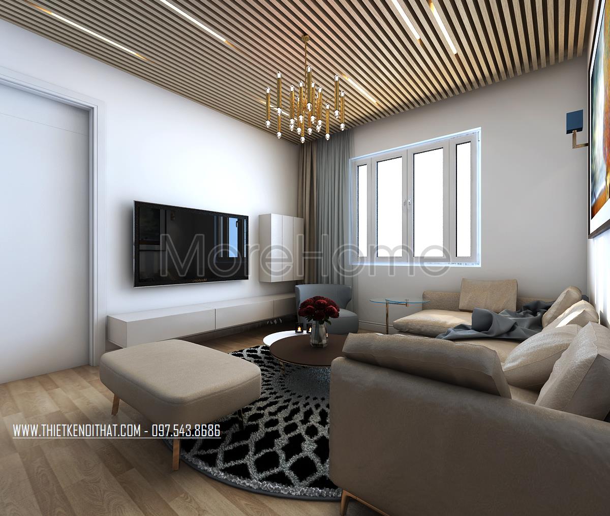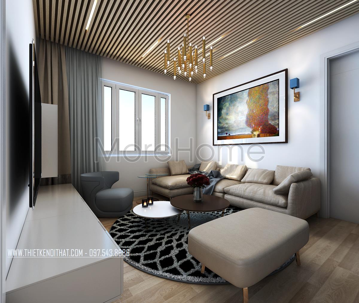 Thiết kế nôi thất phòng khách hiện đại mang đến cảm giác thoáng đãng và thư thái cho giả chủ. Kiến trúc sử khéo léo sử dụng thiết kế với tone màu nhẹ nhàng phối kết hợp với tone màu trầm tối từ thảm trải sàn hay kệ, bàn … tạo sự cân bằng và dung hòa về màu sắc trang trí. Thiết kế của sổ mở rộng giúp mang ánh sáng tự nhiên vào căn phòng, mang lại sự tươi trẻ cho không gian.