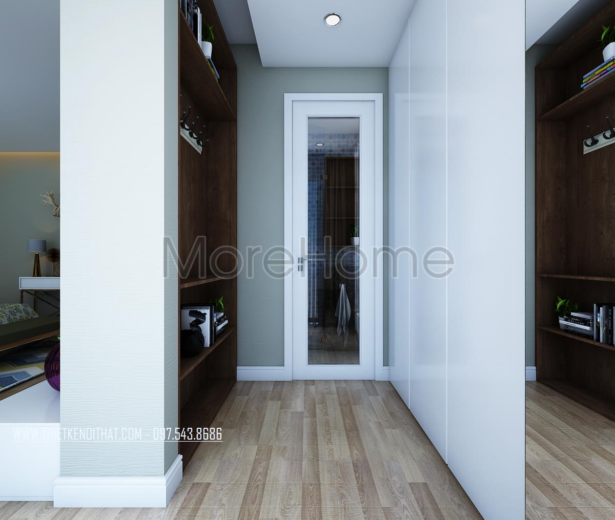 Thiết kế phòng ngủ master được chia làm hai khu rõ ràng tạo cảm giác riêng tư cho gia chủ. Vách ngăn dựng đứng được làm bằng thanh gỗ tự nhiên tone màu dịu nhẹ vừa đảm bảo tính thẩm mỹ cho không gian vừa tránh được sự bí bách và khó chịu từ các bức tường thô hay vách bê tông cứng.