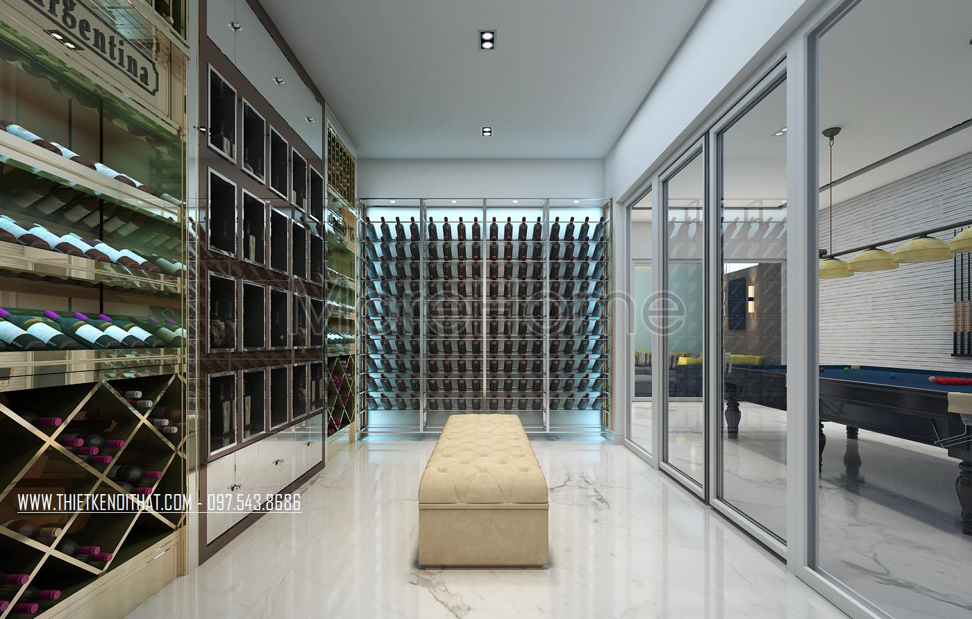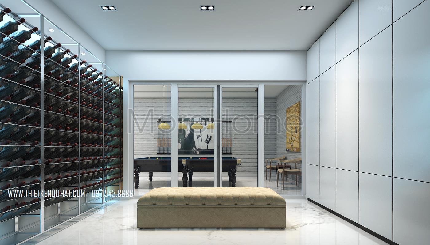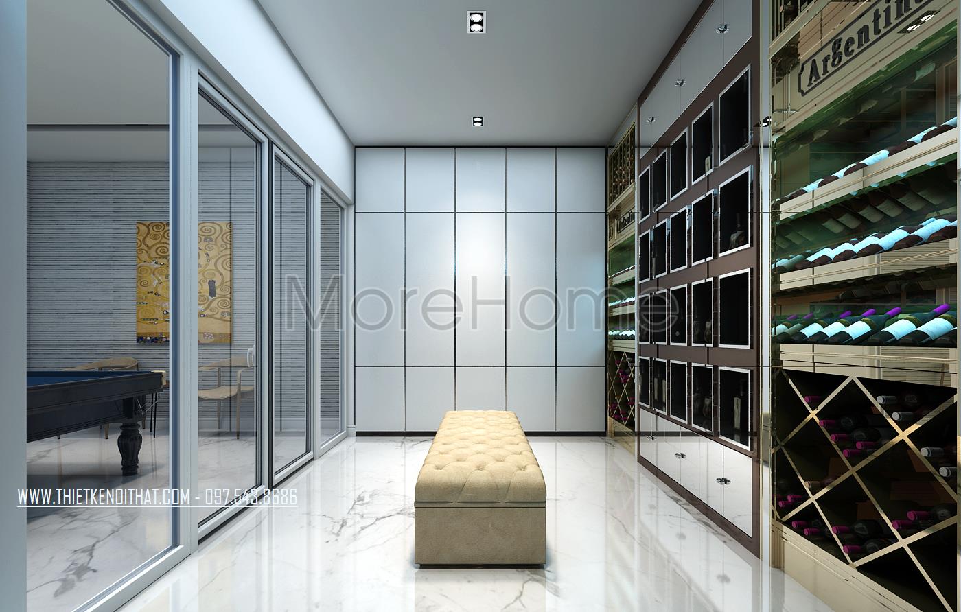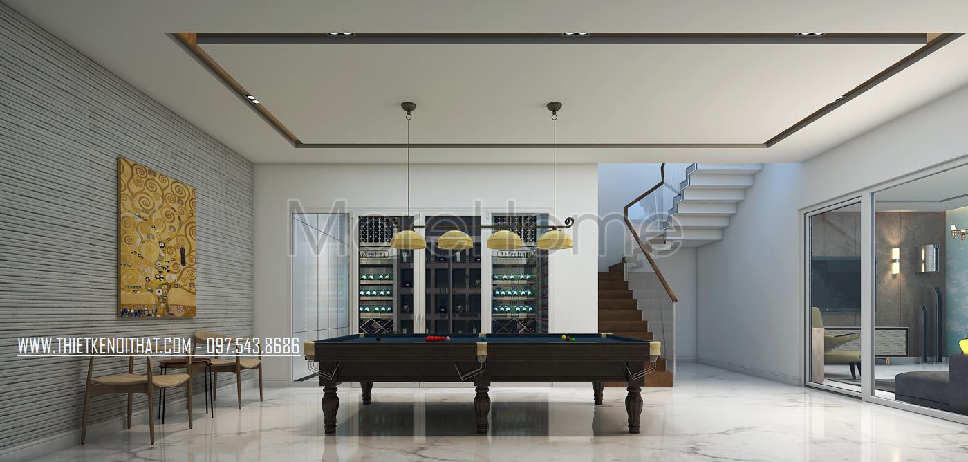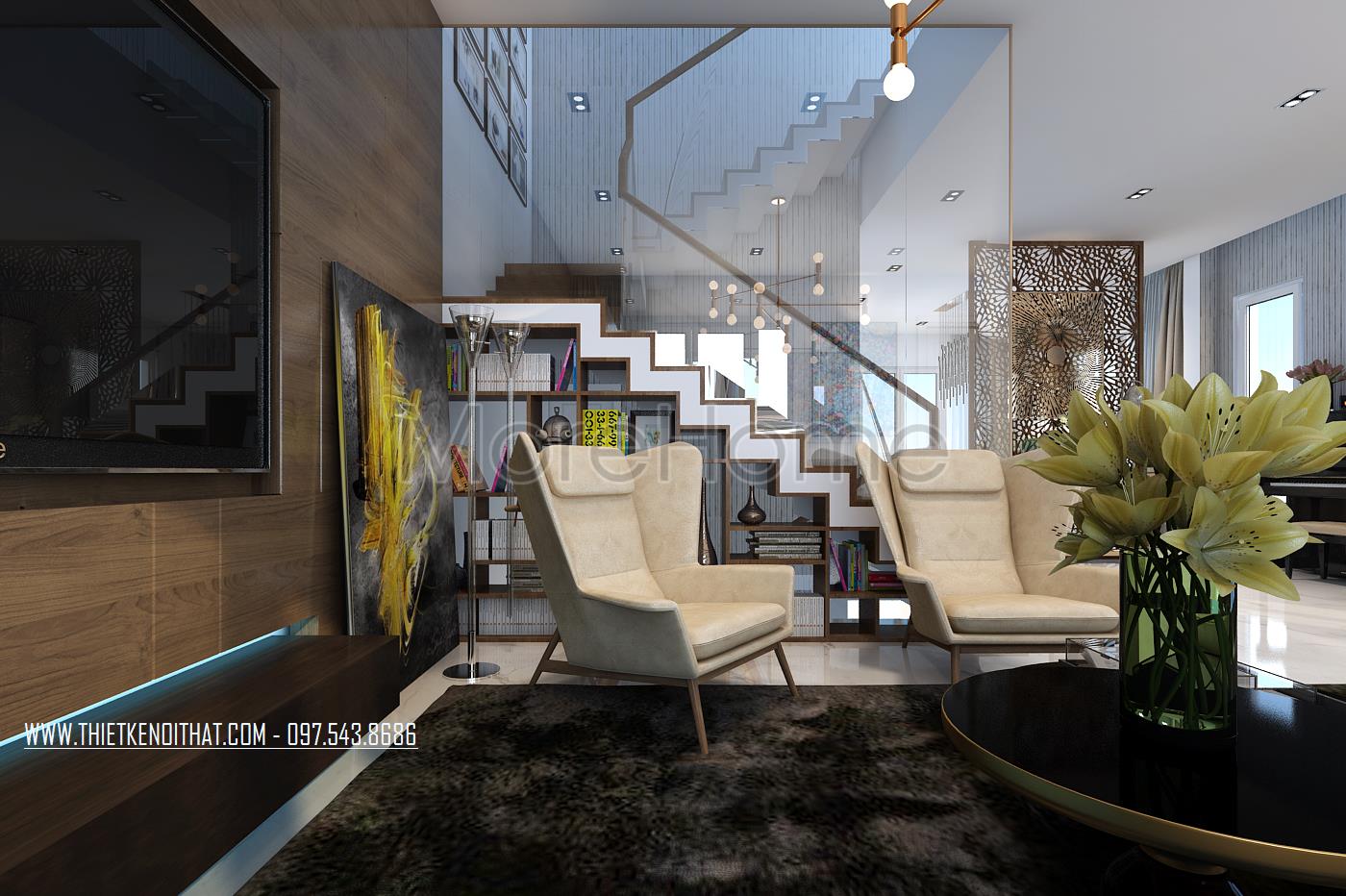 Ở thiết kế nội thất biệt thự Vinhome này, chúng ta dễ dàng bị thu hút bởi thiết kế kệ tủ dưới gầm cầu thang. Thông thường, đây là không gian khá tối, ẩm, là nơi mà gia chủ luôn muốn cất giấu đi, tuy nhiên, ở đây, không gian này lại thu hút sự chú ý lớn nhờ vào thiết kế kệ tủ đa năng hiện đại. Thiết kế kệ gỗ nhiều tầng với sự sắp xếp hợp lý giúp mang đến sự tiện nghi cho gia chủ mà lại làm tăng tính thẩm mỹ cho không gian.