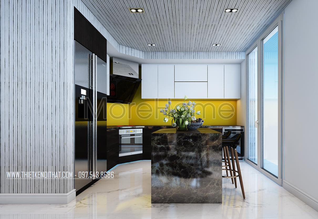 Thiết kế nội thất bàn ăn và bếp liền kề với view rộng tạo độ mở cho căn phòng. Bàn ăn thiết kế cách tân sáng tạo không theo khuôn mẫu thông thường giúp tạo sự mới lạ và thu hút sự chú ý của mọi người. Bức vách chắn với hoa văn tinh xảo được thiết kế tỉ mỉ là một trong những điểm nhấn cho không gian này. Thay vì bức tường thô cứng chắn tầm mắt thì kiến trúc sư khéo léo sử dụng thiết kế vách gỗ nhẹ nhàng vừa tạo độ mở cho không gian vừa giảm sự bí bách, đơn điệu của thiết kế 4 bức tường truyền thống.