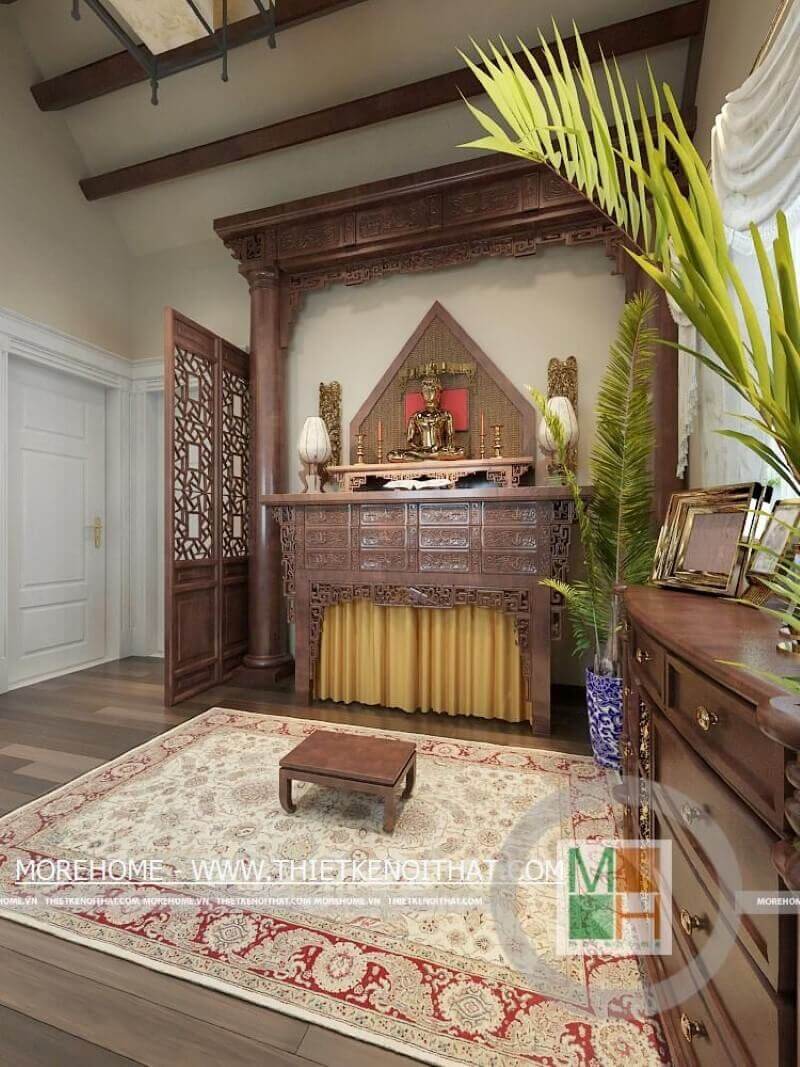 Mẫu bàn thờ gỗ tự nhiên, chạm khắc họa tiết tỉ mỉ, mộc mạc cho không gian yên tĩnh của chốn linh thiêng