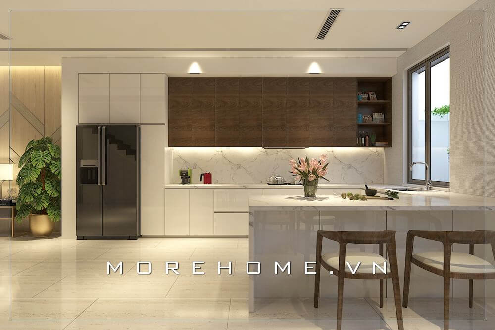 Thiết kế nội thất phòng bếp hiện đại sử dụng tone màu nâu- trắng tạo điểm nhấn, hài hòa với không gian nhà biệt thự