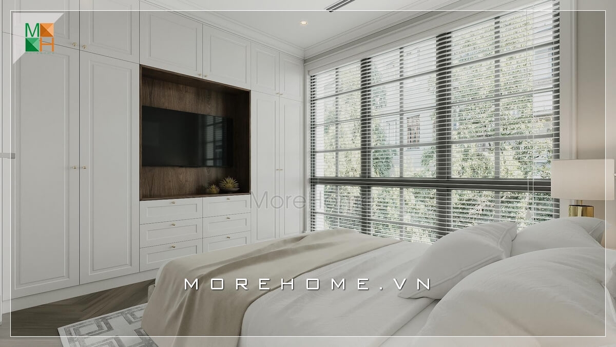 Phòng ngủ hiện đại được thiết kế với sắc trắng tinh tế nhẹ nhàng cùng với việc bố trí vách kính đón ánh sáng trực tiếp đem đến những cảm giác thích thú, thoải mái cho những phút giây thư giãn.